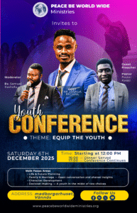 Peace Be World Wide Ministries warmly invites all youth to a special empowerment service dedicated to spiritual growth, guidance, and inspiration. This service is designed to nurture young people in their walk with God, helping them make wise decisions, build strong character, and prepare for their future with confidence. Through spirit-filled teachings, open conversations, and practical insights on life, family, and purpose, this gathering will
